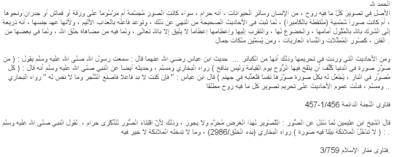 Ibn 'abbaas (moge Allaah tevreden met hem zijn) heeft ook gezegd, dat de Profeet heeft gezegd (in vertaling): "Iedere afbeelding-maker zal in het Vuur zijn, en iedere afbeelding die hij heeft gemaakt, zal voor hem verschijnen en zal hem martelen in de Hel." Ibn 'Abbaas zei: "Indien je dat (per se) moet doen, maak dan bomen en dingen die geen ziel hebben." [overgeleverd door al-Bukhaari en Muslim]. De algemene betekenis van de ahaadeeth is dat het absoluut verboden is om afbeeldingen te maken van iets wat een ziel heeft.